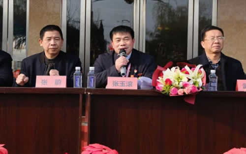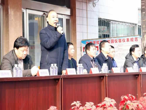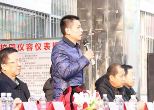 华龙学校董事长兼校长郭同春为“时代楷模”张玉滚同志的到来致欢迎词。