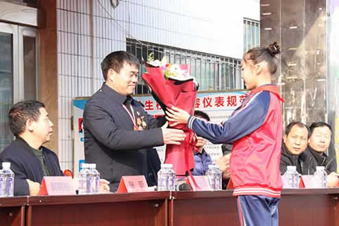 华龙学校学生代表为张玉滚同志献花,表达全体师生的钦佩之情。